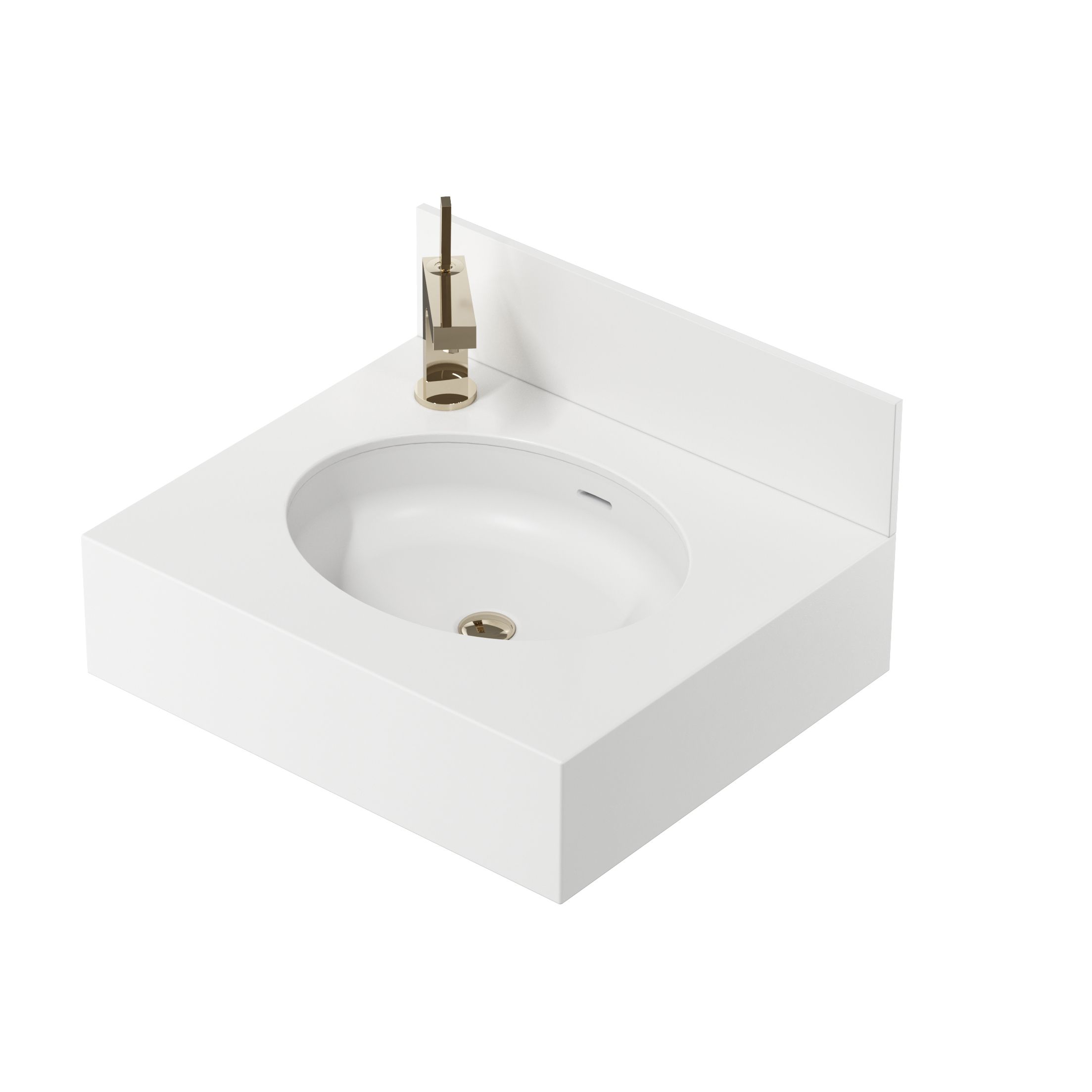This floating oval basin and vanity unit in solid surface matt white is available in two size options – 600mm and 800mm wide.